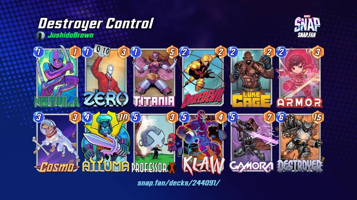 I got Nebula while pulling on X-23’s banner, and she slots right into my Destroyer Control deck. This deck isn’t too different from classic Ongoing Destroyer - It wants to win a lane with Armor/Prof X + some cards in one lane and Destroyer in another. The difference is that it’s replaced the Spectrum/Ongoing package with more control and tempo cards. Gamora serves as an alternate turn 5 play with Daredevil and an alternate turn 6 play alongside a 1 drop.