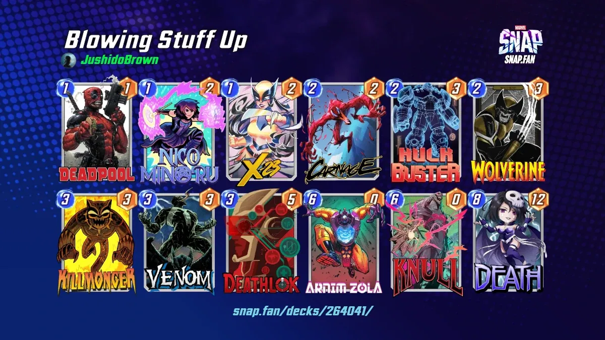 X-23 made her debut in Snap this month, bringing a bunch of new deck-building possibilties with her. I’m still trying to find a way to put her in a sort of good cards midrange deck, but she slots perfectly into a Deadpool Destroy deck. That extra energy she gives on destruction is so good for Deadpool variations of Destroy because that 1 energy is all you need to fit in Deadpool and make him even bigger. I don’t have Knull , which lowers the ceiling a bit and just auto-loses me mirrors, but it does let me run America Chavez , increasing my consistency. And even without Knull, a bigass Deadpool, a Taskmaster that copies that Deadpool’s power, and a free Death is nothing to sneeze at.
