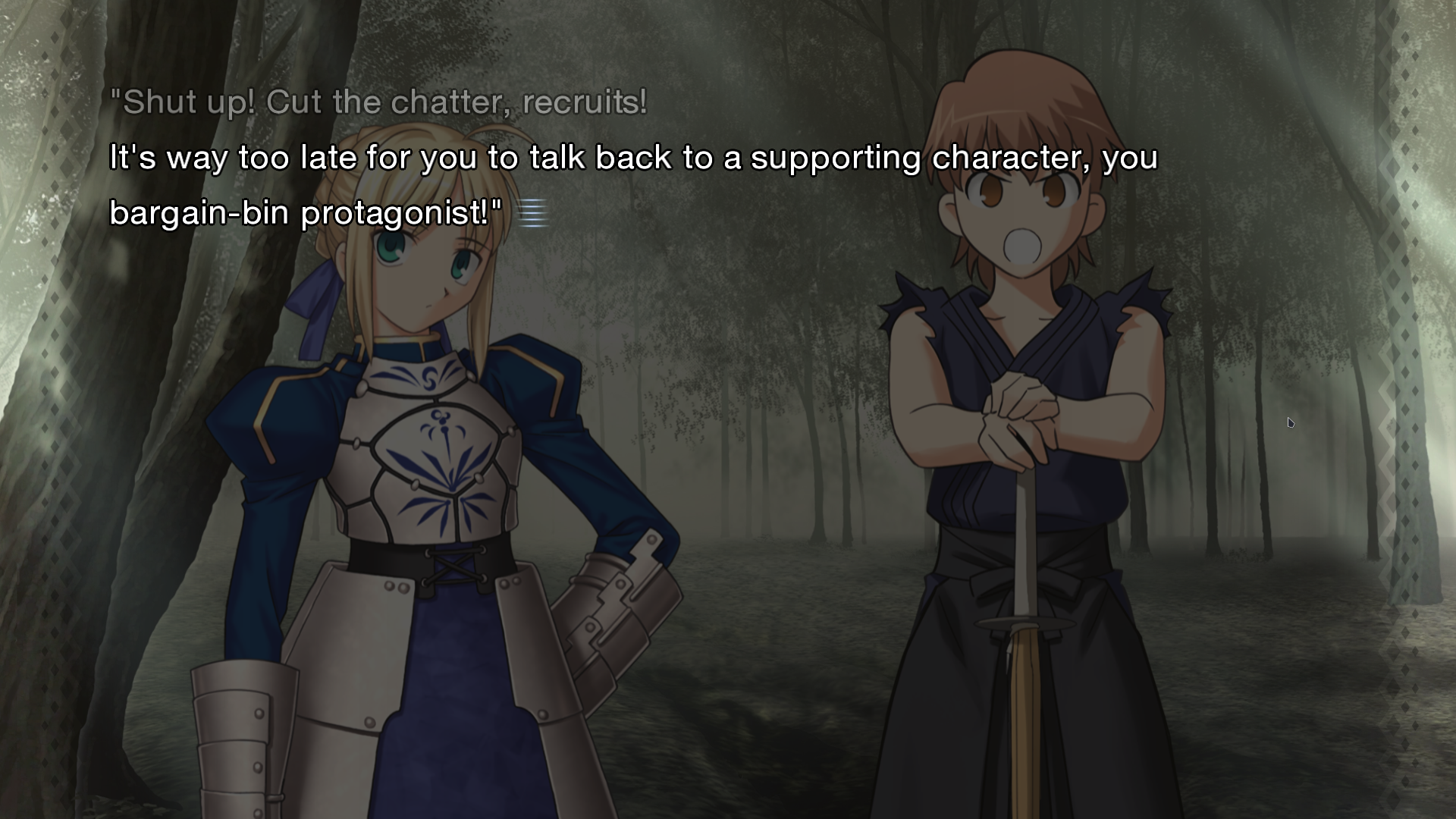 Now, that sounds like prime action setup, and it is, but the vast majority of this game is comprised of the Loop portion. You spend each 4 day loop interacting with various FSN characters from Shirou’s perspective. Eventually, you will unlock scenes that advance the plot that I mentioned, but most of this game is experiencing Slice-of-Life scenes with the FSN roster. And believe it or not, that is actually plot-relevant. I cannot stress enough how much of a must-play this game is if you enjoyed Fate/Stay Night at all. You get to see so much more of the characters. Just about everyone gets plenty of moments to shine. And this game is funny funny. Genuine laughs here, man. It’s just great. Rider all but verbally offers Shirou some ass to repair her bike, Shirou and Shinji duel for the fate of the world, Saber plays soccer with kids, it’s all dumb, good fun. The only ones who don’t get a lot of focus are Assassin, who is bound to the temple gate, so he can’t leave for shenanigans like everyone else, and Berserker, who is relegated to essentially being a force of nature both for the fact that he literally cannot speak and another, actual plot related reason. Still, they both get to look cool at the end. If you wanted True Assassin to show up, I’m very sorry. The only thing I can tell you is go read/watch the Camelot Arc from FGO because he’s honestly a MVP in that.